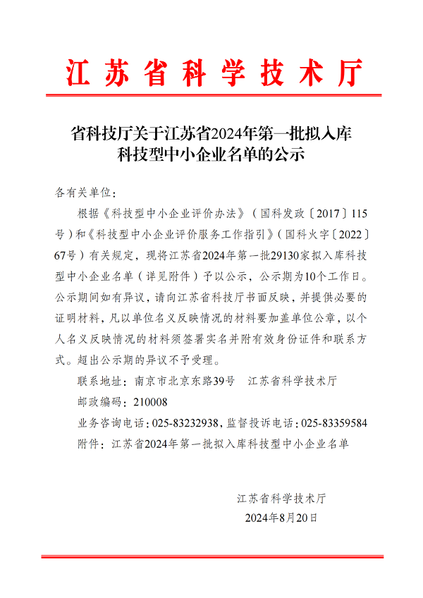 2024年8月20日,江蘇省科學(xué)技術(shù)廳發(fā)文公布了江蘇省2024年第一批擬入庫科技型中小企業(yè)名單,南京微測生物科技有限公司位列其中成功入選。